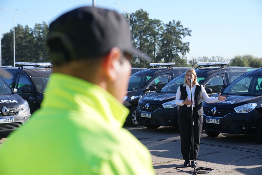 La vicegobernadora, Gisela Scaglia y el ministro de Justicia y Seguridad provincial, Pablo Cococcioni, encabezaron este miércoles el acto de entrega de 30 camionetas adaptadas para patrullaje, destinadas a la Agencia Provincial de Seguridad Vial (APSV) y a la Guardia Provincial, por una inversión total de $ 1.350.000.000.