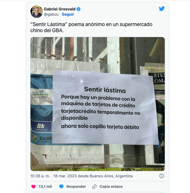 Al parecer en un supermercado chino del Gran Buenos Aires tenían algunas dificultades con el posnet, y decidieron comunicárselo a sus clientes con un cartel que se volvió viral por lo inentendible.