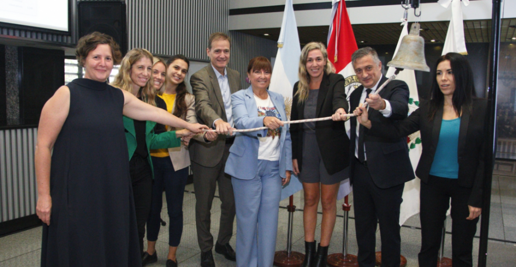 Finalmente, las autoridades de la Bolsa de Comercio de Rosario, las disertantes y referentas presentes dieron el toque de campana para dar oficialmente inicio a la jornada.