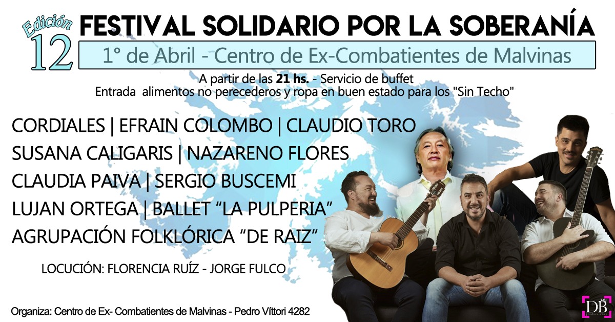 El Centro de Ex-Combatientes de Malvinas de Santa Fe organiza el 12º Festival Solidario por la Soberanía. El evento se llevará acabo el próximo sábado 1º de Abril, desde las 21 en la sede ubicada en Pedro Vittori al 4.282 de la ciudad capital.