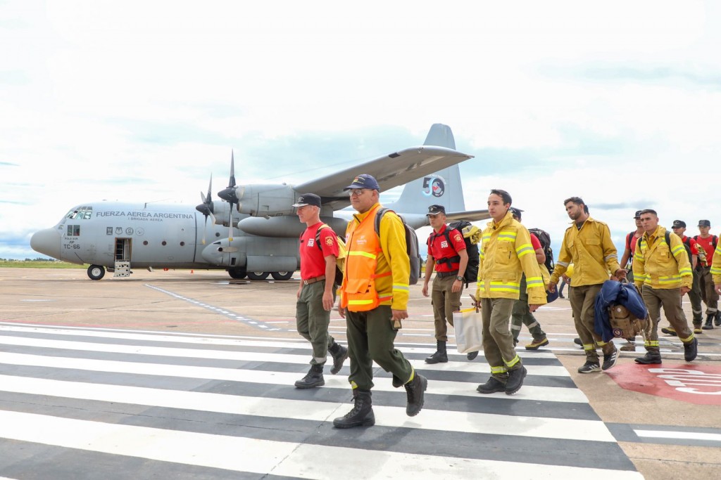 Los brigadistas fueron recibidos por ministro de Justicia y Seguridad, Pablo Cococcioni; el secretario de Protección Civil y Gestión de Riesgos Marcos Escajadillo, y la secretaria de Gestión Institucional, Virginia Coudannes; entre otros funcionarios provinciales.