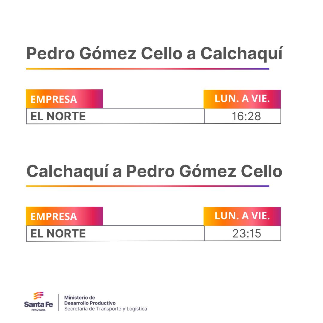 El Ministerio de Desarrollo Productivo, a través de la Secretaría de Transporte y Logística, informa que desde el lunes 5 de agosto se agregan nuevos horarios y servicios para el transporte público de pasajeros en el corredor Pedro Gómez Cello y Calchaquí, que conecta los departamentos San Justo y Vera. Esta resolución es el resultado de la gestión del Gobierno de la Provincia a través de su cartera productiva: “Estamos trabajando en fortalecer el servicio de transporte en toda la provincia y en brindar más y mejores opciones de traslado a los pasajeros”, indicó la secretaria de Transporte y Logística, Renata Ghilotti.