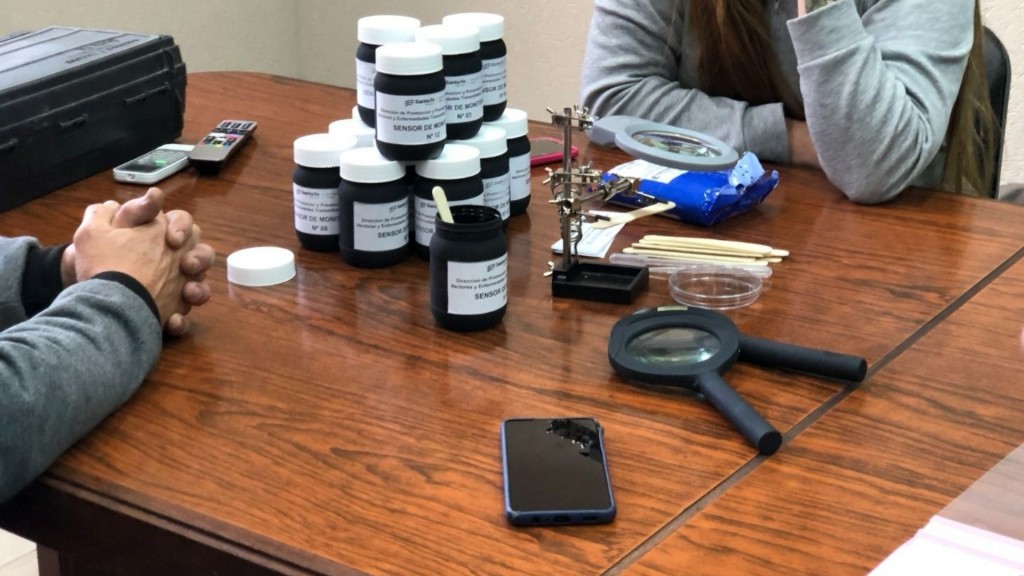 Con la colocación de ovitrampas se identifica que hay “huevos nuevos”. Las ovitrampas son pequeños recipientes de plástico de colores oscuros, en donde se pone agua y se le añade un bajalenguas con un clip. El aedes adulto pone los huevos en la pared del frasco, pero también en el bajalenguas. “Todas las semanas, siguiendo un protocolo estricto, se retiran y se observan los bajalenguas con lupas especiales, llamadas estereoscópicas, para ver si hay huevos, y si son aédicos”, precisó Chumpitaz.
