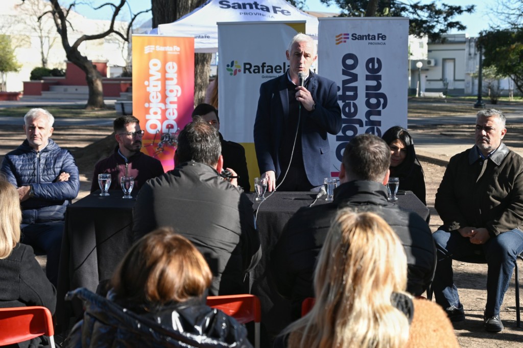 El programa “Objetivo Dengue”, es una política interministerial implementada por el gobernador Maximiliano Pullaro para toda la provincia de Santa Fe. Con motivo de conmemorarse este lunes el “Día Internacional contra el Dengue”, autoridades provinciales visitaron la ciudad de Rafaela para participar de una actividad conjunta con el Municipio local para la concientización y prevención contra la proliferación del mosquito.