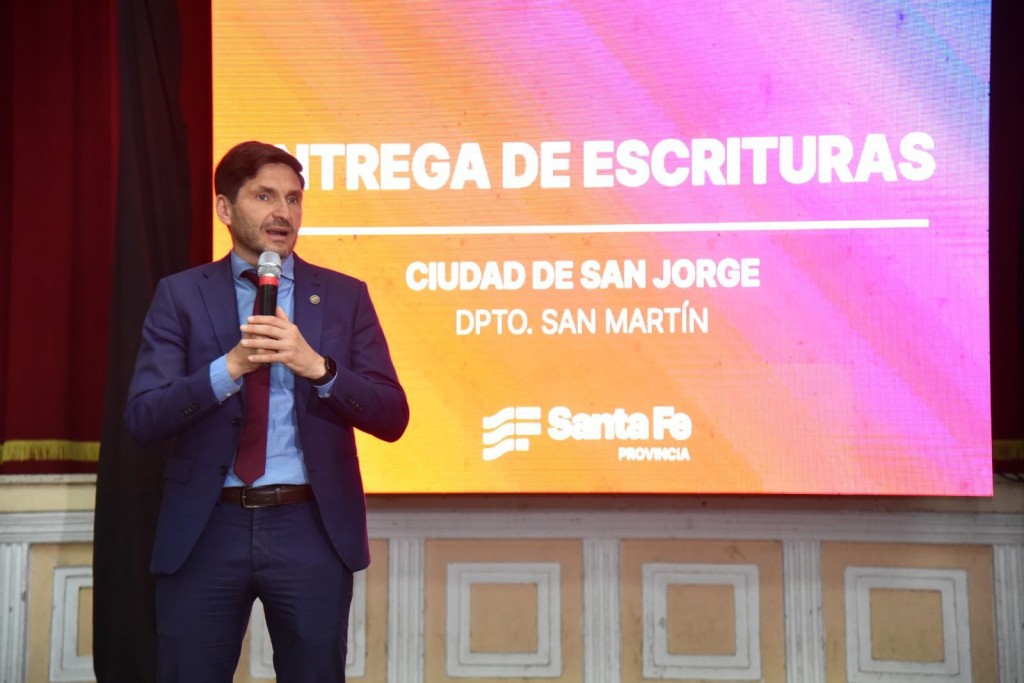 Previamente, el gobernador Pullaro visitó San Jorge, donde entregó la escritura de sus viviendas a 28 familias y firmó los contratos para la ejecución de 27 nuevas unidades habitacionales.