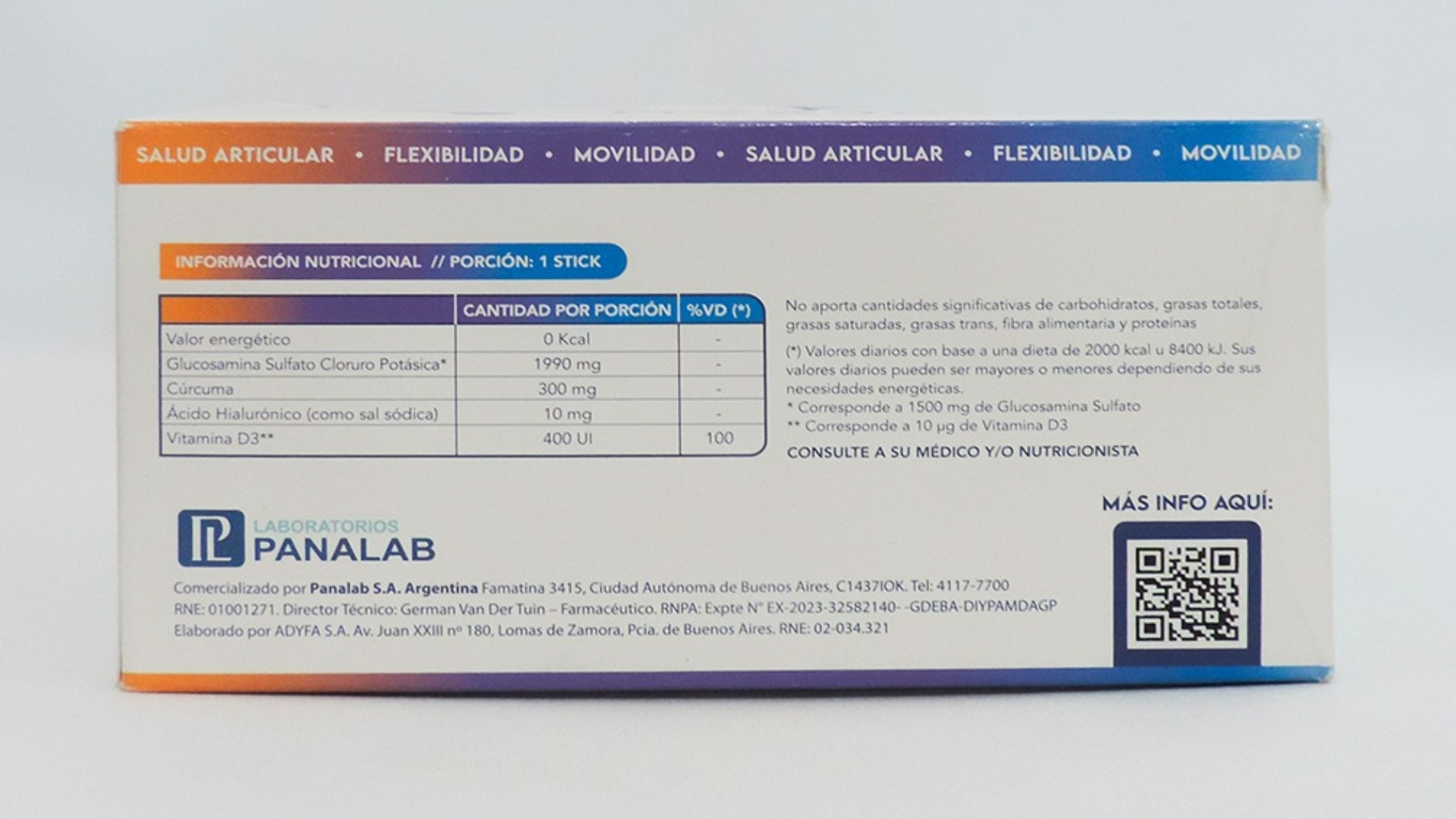 Producto: Suplemento dietario a base de glucosamina sulfato cloruro potásica, cúrcuma, ácido hialurónico y vitamina D3, en polvo para reconstituir